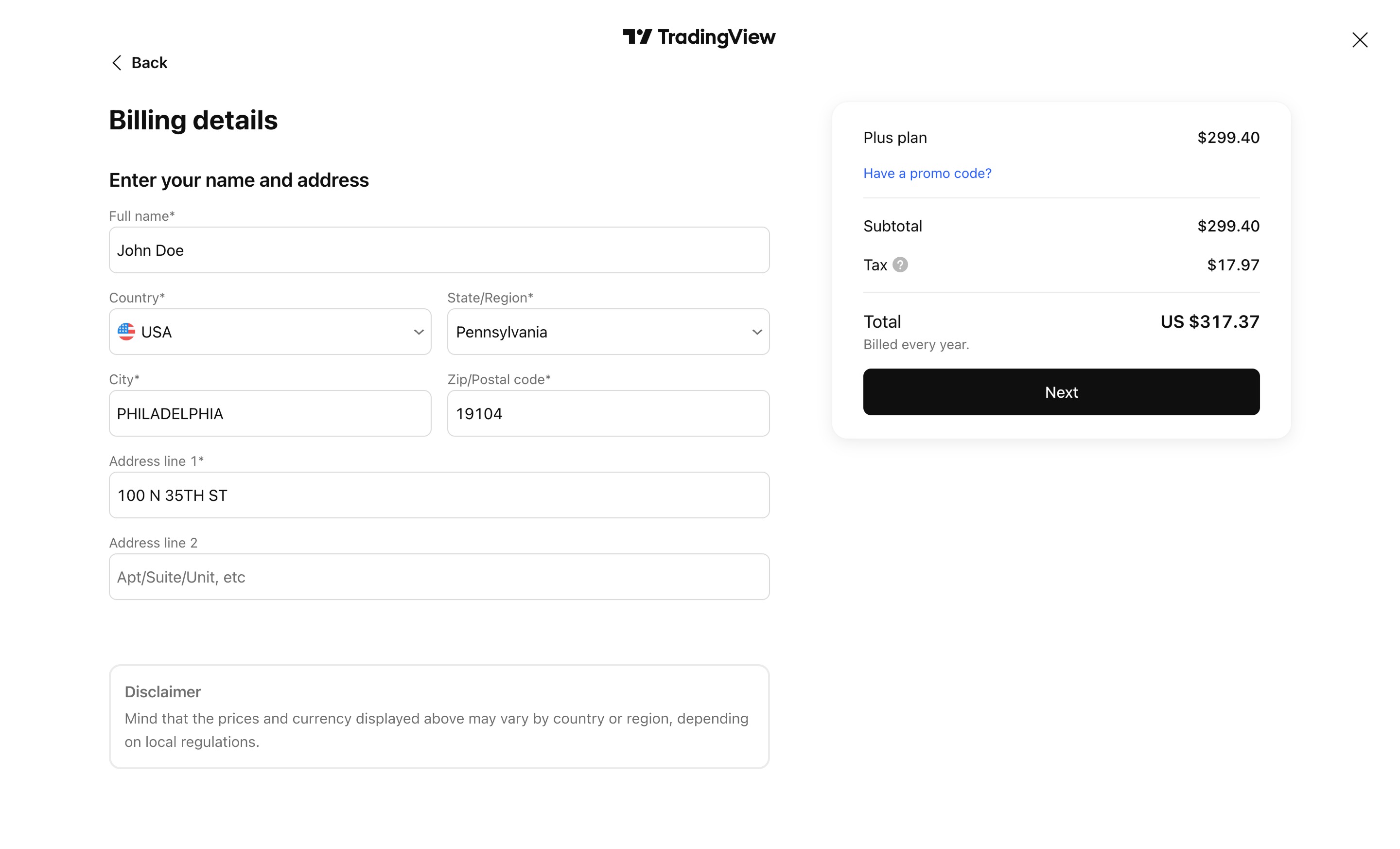หาก TradingView มีหน้าที่ต้องชำระภาษี ภาษีจะถูกเพิ่มเข้าไปในยอดชำระและต้องชำระให้ TradingView ในเวลาเดียวกันกับการชำระค่าบริการ ภาษีจะถูกคำนวณตามรหัสไปรษณีย์หรือประเทศที่บัญชีของคุณถูกเรียกเก็บเงิน หากคุณอยู่ในเขตอำนาจศาลที่ต้องเสียภาษี คุณจะเห็นภาษีเป็นรายการหนึ่งในใบแจ้งหนี้และใบเสร็จรับเงินของคุณ
