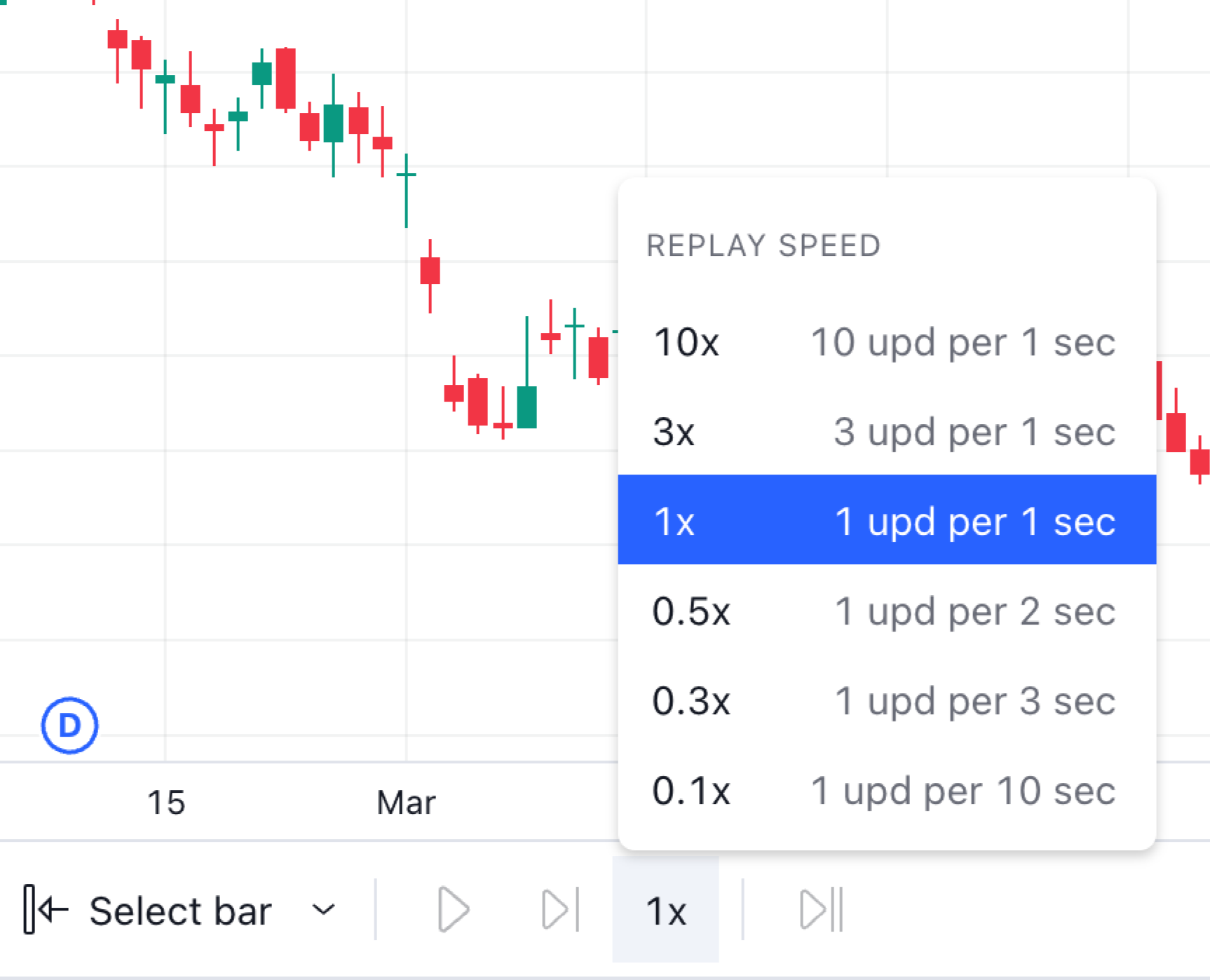 หากต้องการเข้าถึงข้อมูลระหว่างวันเชิงลึก คุณสามารถเลือกจุดเริ่มต้นสำหรับ โหมดแสดงแท่งเทียนแบบเล่นซ้ำ ในกรอบเวลาที่สูงกว่า จากนั้นจึงสลับไปที่กรอบเวลาที่ต่ำกว่าตัวอย่างเช่น หากคุณต้องการเล่นแท่ง 1 นาทีที่เก่ากว่า คุณสามารถไปที่กรอบเวลารายวัน เปิดโหมดเล่นซ้ำ เลือกตัวเลือก "เลือกแท่ง" และเลือกจุดเริ่มต้นด้วยตนเองที่ใดที่หนึ่งบนชาร์ตภายในขีดจำกัดแผนของคุณ จากนั้นสลับไปที่กรอบเวลา 1 นาทีและกด “เล่น”