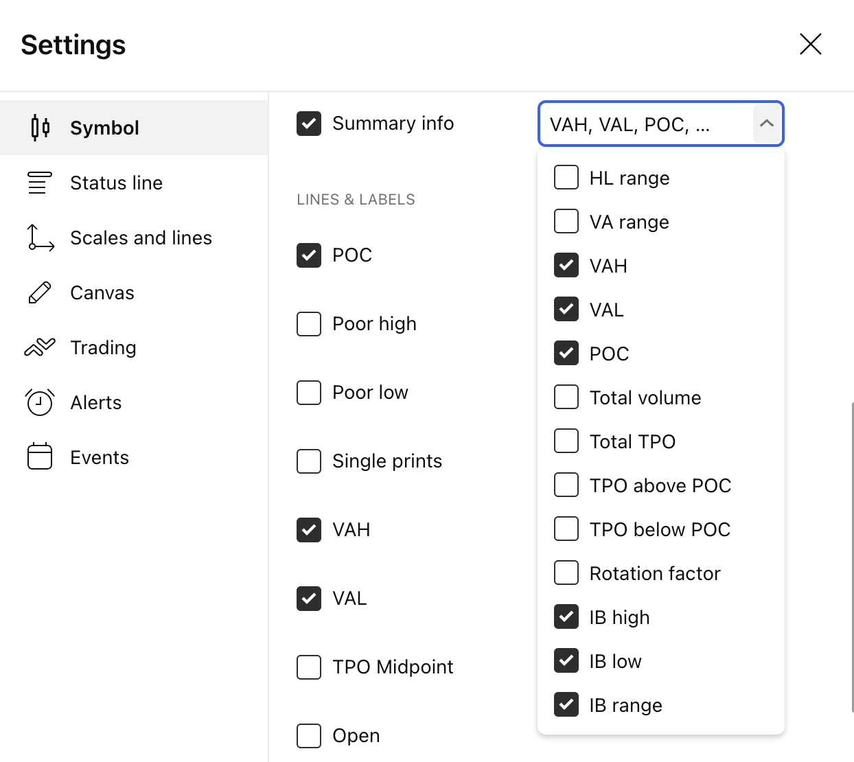 - VAH: สลับการแสดงผลของบรรทัดและป้ายกำกับค่าสูงสุดของพื้นที่ค่าสำหรับช่วงเวลา TPO