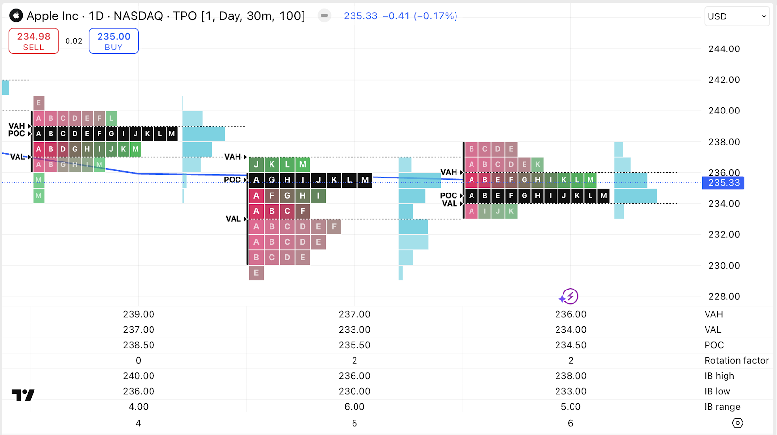 - บล็อกของตัวอักษรหนึ่งตัวปรากฏขึ้นที่ระดับราคาแต่ละระดับ ซึ่งเป็นช่วงที่มีการเคลื่อนไหวของตลาดตรงกับช่วงเวลาที่ตรงกับตัวอักษรนั้นๆ ตัวอย่างเช่น ทุกระดับที่บล็อก "A" ปรากฏอยู่นั้น ได้รับการเข้าเป้นครั้งแรกของช่วงเวลาโปรไฟล์