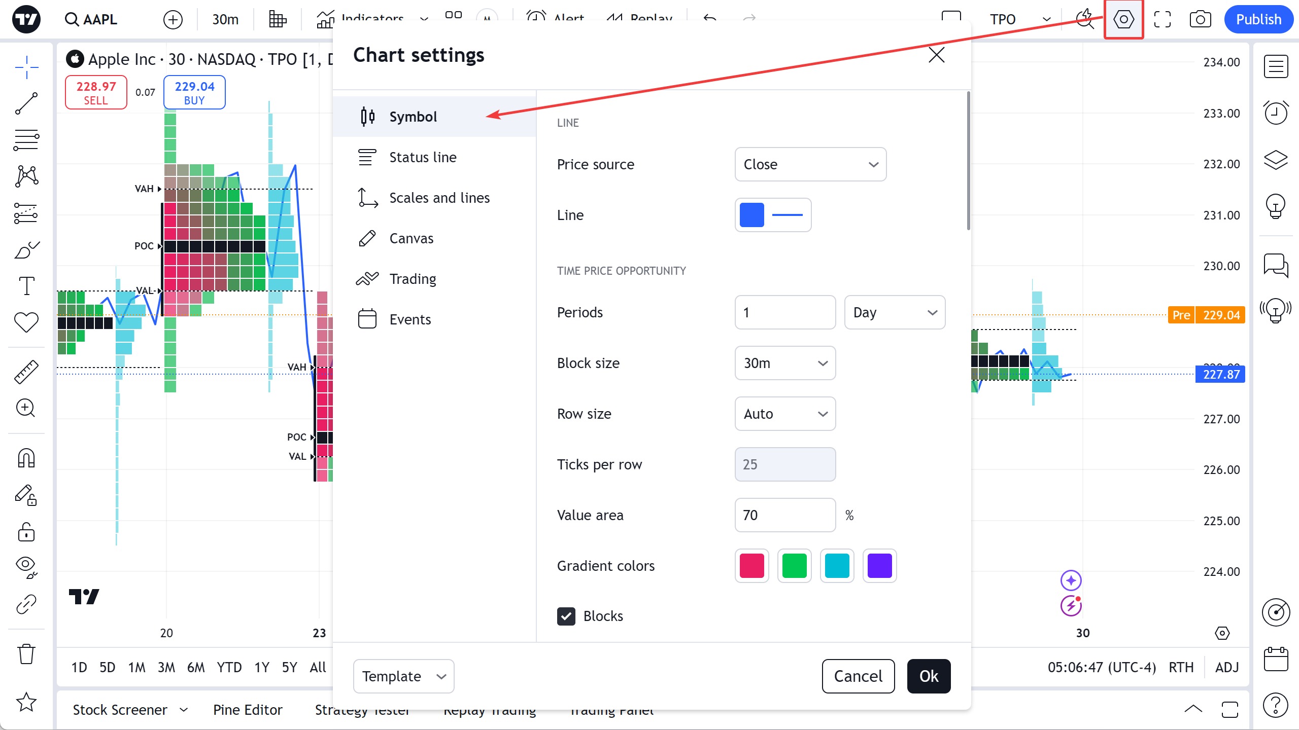 - ราคาปิด: สลับการแสดงผลของป้ายราคาปิดสำหรับช่วงเวลา TPO