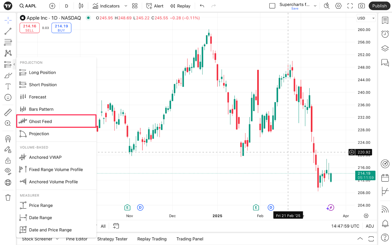 ด้วย Ghost Feed คุณจะสามารถเห็นว่าแท่งเทียนอาจดูเป็นอย่างไรเมื่อมองในทิศทางใดทิศทางหนึ่ง รวมถึงจุดสูงสุดและจุดต่ำสุดที่เป็นไปได้ของแท่งเทียนเหล่านี้ตามการตั้งค่าของเครื่องมือวาดภาพนี้ในการเริ่มใช้งาน ให้ค้นหาเครื่องมือการคาดการณ์และการวัดค่าบนแถบเครื่องมือรูปวาดที่ด้านซ้ายของชาร์ต และเลือก Ghost Feed