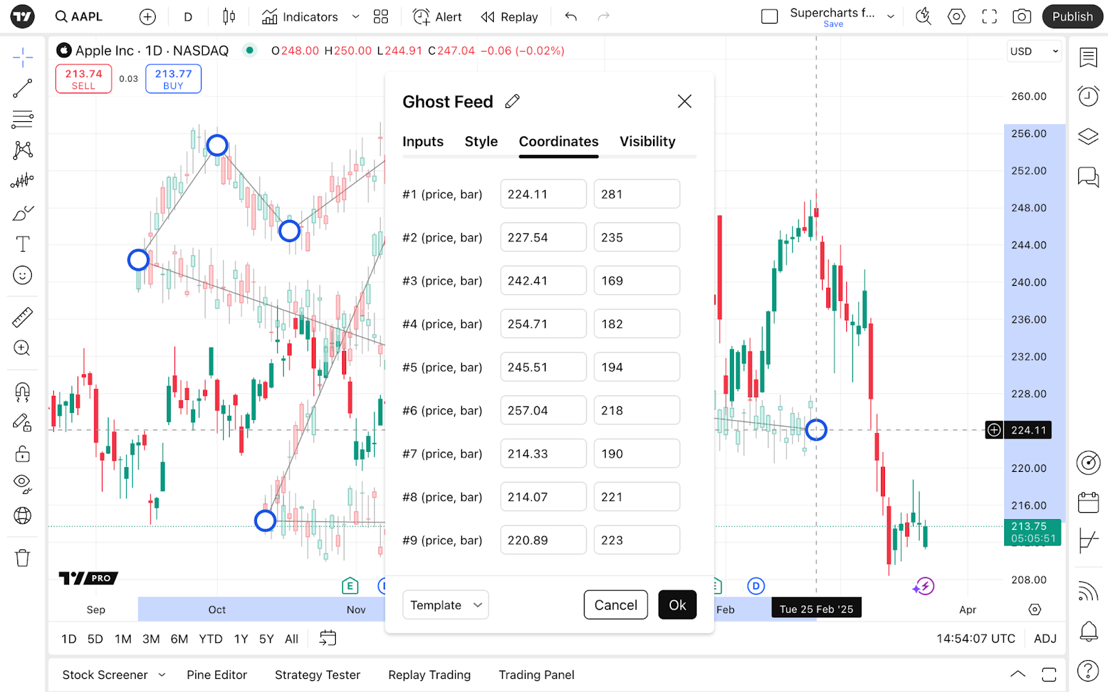 เนื่องจาก Ghost Feed เป็นเครื่องมือวาดภาพ หากคุณเปลี่ยนกรอบเวลา ภาพวาดเหล่านี้ก็จะยังคงอยู่ สมมติว่าคุณอยู่ในชาร์ตรายวัน และตอนนี้ต้องการย้ายไปที่ชาร์ต 4 ชั่วโมง หากคุณทำเช่นนั้น ฟีด Ghost จะไม่เปลี่ยนแปลงเพื่อความสะดวกของคุณ เมื่อคุณเปลี่ยนกรอบเวลาและไม่ต้องการ Ghost Feed ในทุกกรอบเวลา ให้ลบช่วงเวลาที่คุณไม่ได้ใช้เครื่องมือนี้