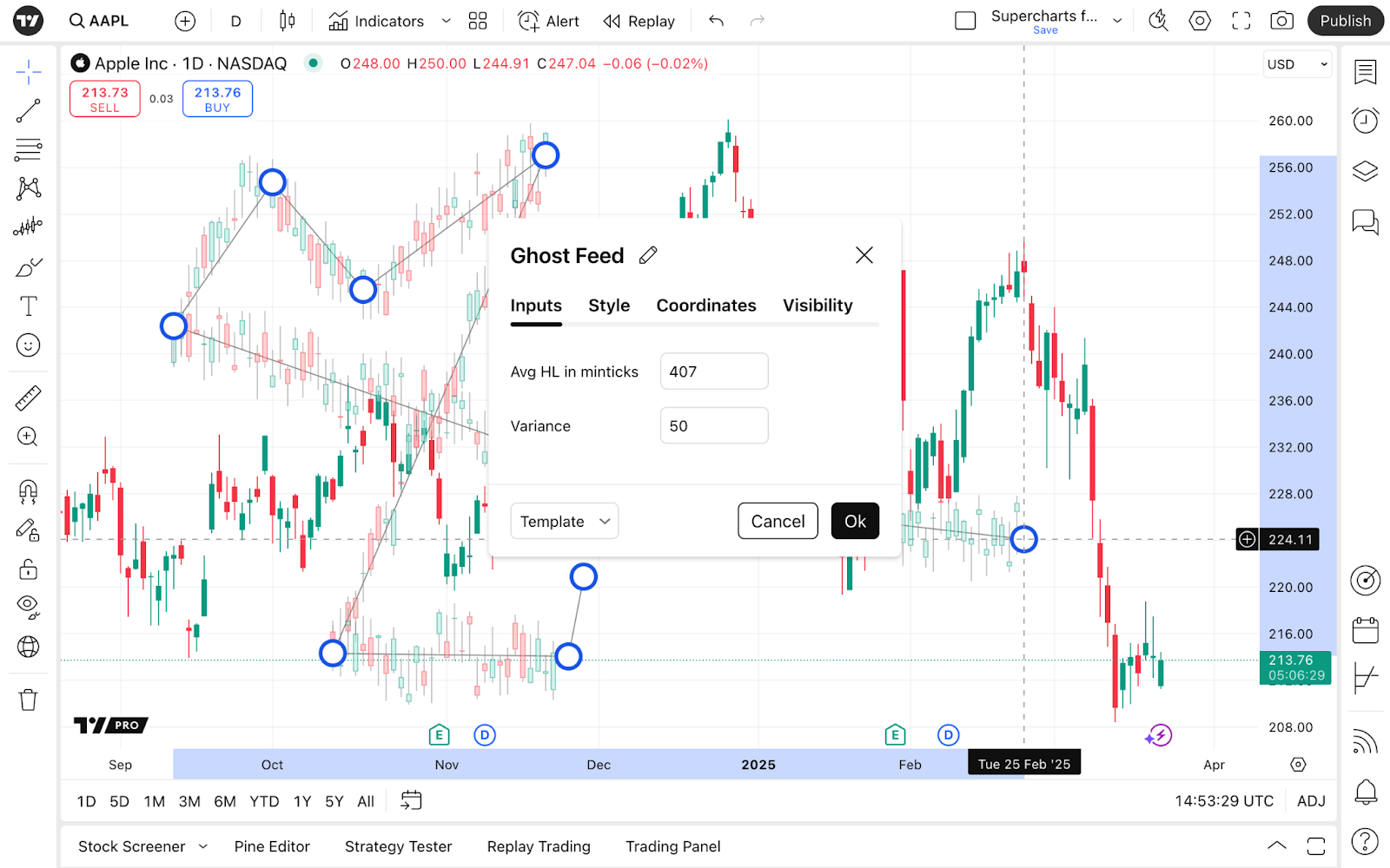Ghost Feed เป็น เครื่องมือวาดภาพ ที่ช่วยให้คุณคาดการณ์จากการเปลี่ยนแปลงของราคาในช่วงล่าสุด แม้ว่าจะไม่ได้มีจุดประสงค์เพื่อให้คุณเห็นภาพที่ชัดเจนว่าอะไรกำลังจะเกิดขึ้น แต่สามารถให้ข้อมูลเชิงลึกอันมีค่าแก่คุณเกี่ยวกับข้อเสนอแนะของคุณเกี่ยวกับการเคลื่อนไหวของราคาในอนาคตได้In this solution you'll learn: