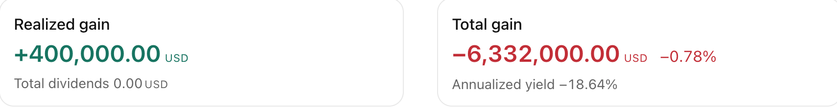 Total gain is the combined realized and unrealized financial result of the portfolio, accounting for all income and expenses.Total gain % is the overall portfolio return calculated using the Time-Weighted Return (TWR) method. This metric helps evaluate the performance of the user’s strategy.