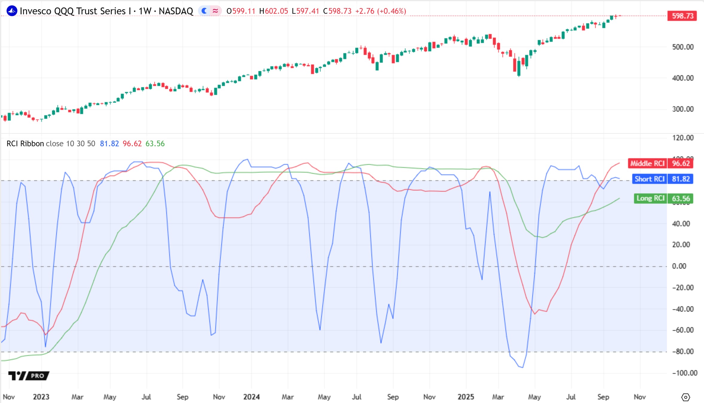 แสดงให้เห็นภาพว่าทิศทางทั่วไปของการเคลื่อนไหวของราคาจะเรียงกันอย่างไรในช่วงเวลาต่างๆ โดยการพล็อตสามชุดของออสซิลเลเตอร์ Rank Correlation Index (RCI) ที่มีช่วงความยาวในการมองย้อนหลังต่างกัน