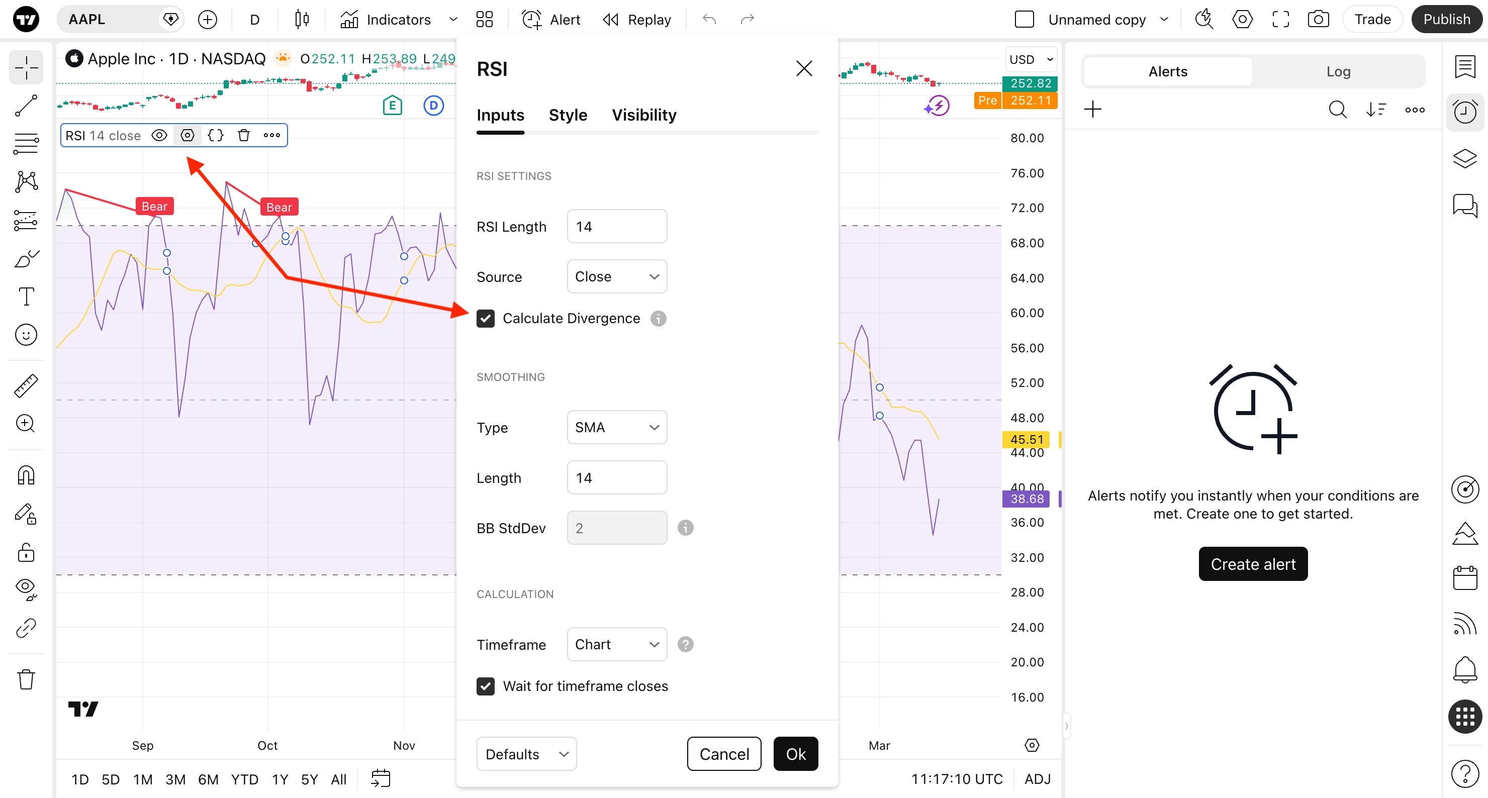 หากต้องการเปิดใช้งานการแจ้งเตือน ให้เปิดการตั้งค่าอินดิเคเตอร์และเปิดใช้งานตัวเลือก คำนวณ Divergence หลังจากนั้น การแจ้งเตือนสำหรับ Regular Bullish Divergence และ Regular Bearish Divergence จะทริกเกอร์เมื่อสัญญาณที่เกี่ยวข้องเกิดขึ้น
