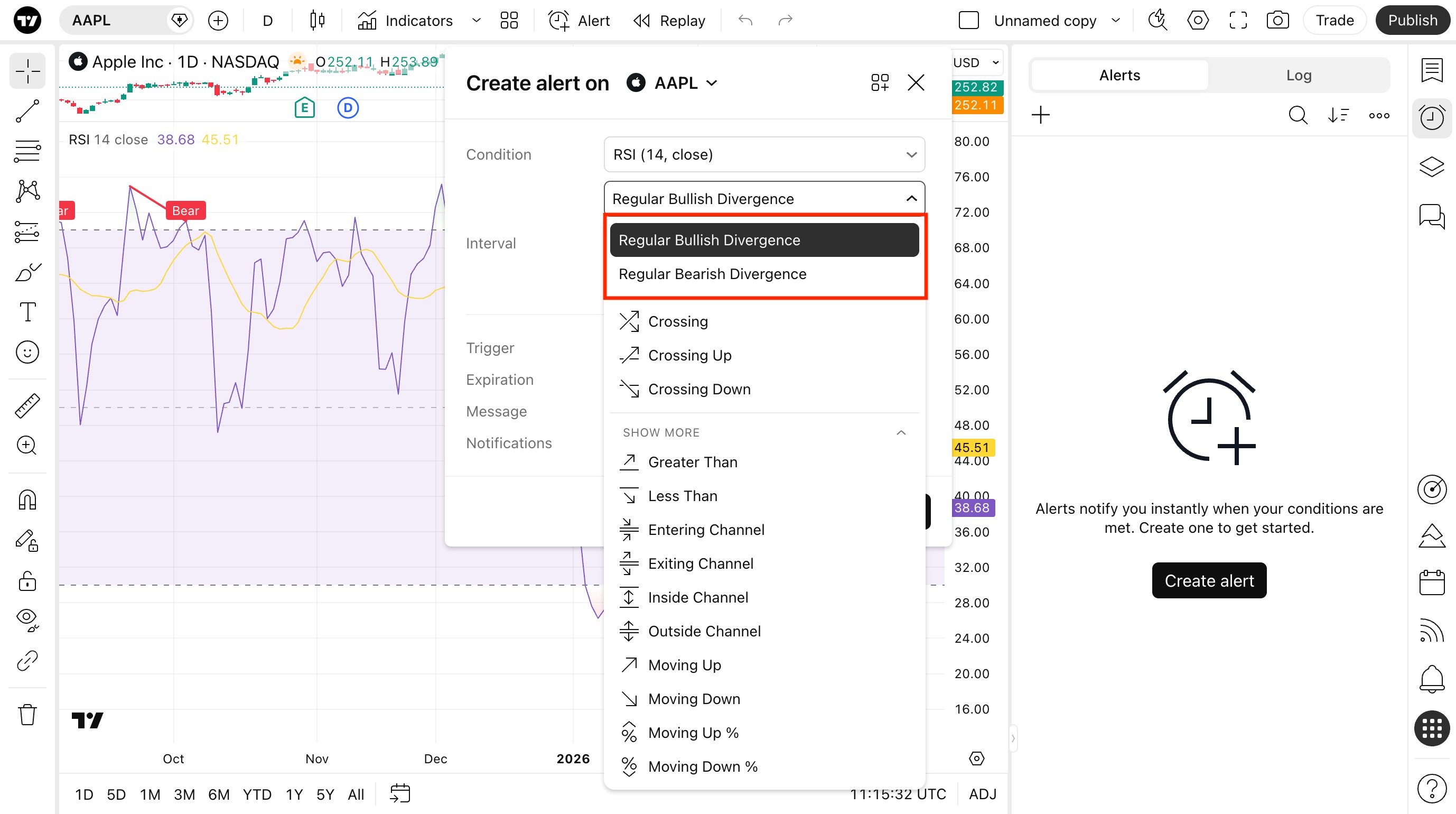 การแจ้งเตือนของอินดิเคเตอร์ RSI ที่มีเงื่อนไข Regular Bullish/Bearish Divergence จะไม่ทริกเกอร์